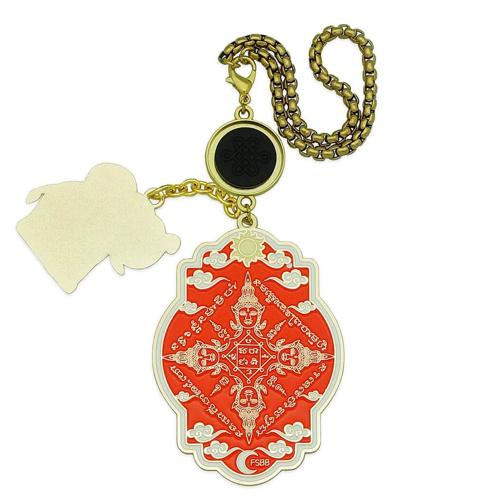 The back of the amulet is charged with sacred energy, showcasing ancient holy mantras, a protective yantra, and the Sun and Moon symbols representing cosmic balance and continuous heavenly support. Accompanying the main amulet is a separate elephant charm, a symbolic offering of devotion—reflecting loyalty, wisdom, and the granting of heartfelt wishes from the deity.