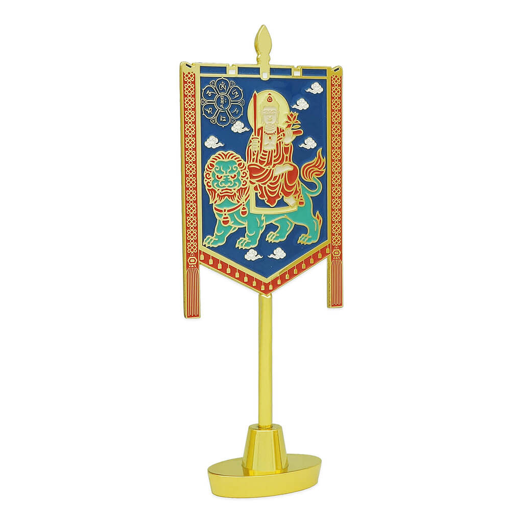 The front features Manjusri seated on his celestial lion, symbolizing courage, clarity, intelligence, and absolute victory over obstacles. His presence helps you: