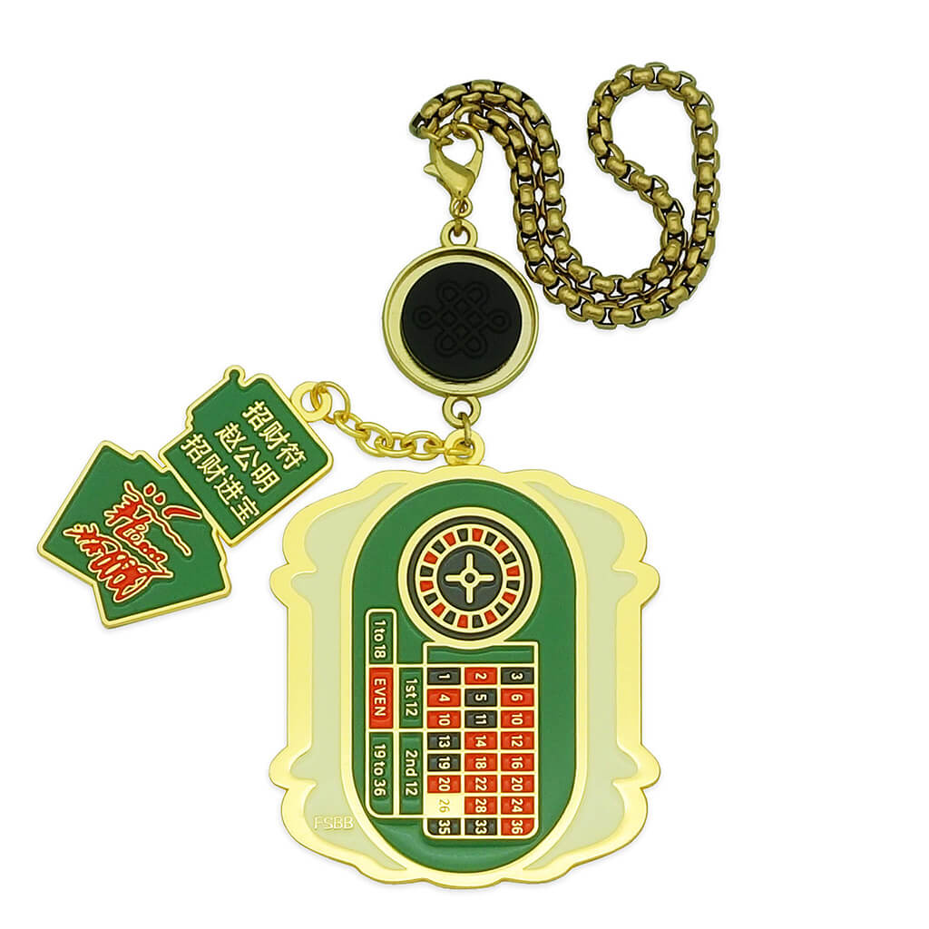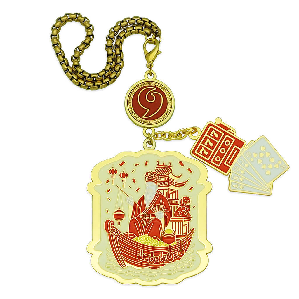 Attached to the amulet are beautifully crafted casino-themed charms — a slot machine with “777” and a winning hand of poker cards — signifying victory, jackpots, and favourable outcomes whenever chance or luck is involved.