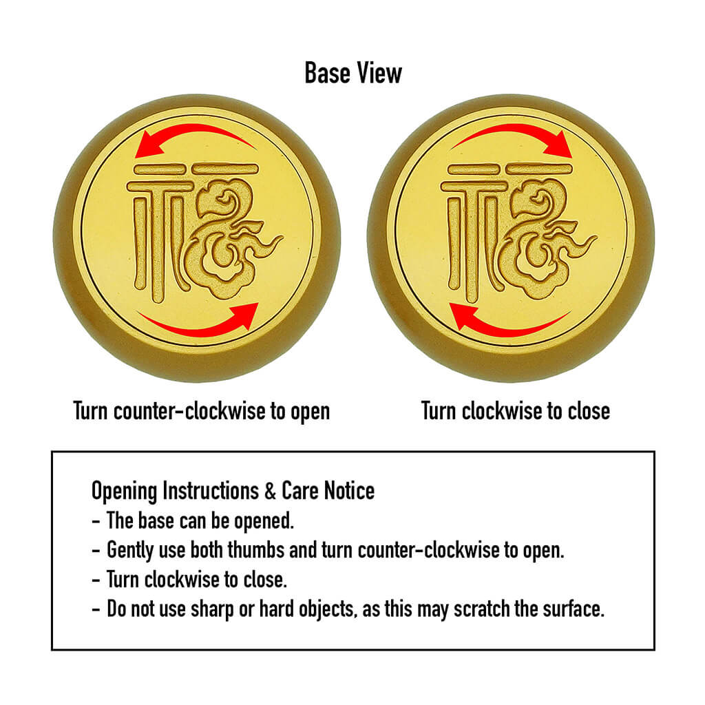 At the base of the Bao is a beautifully engraved Chinese character “Fu” (), meaning blessings, happiness, good fortune, and prosperity. The clever open-and-close design symbolizes the ability to open doors to wealth when needed and close them to retain fortune, preventing money from leaking away. This makes the Bao not just a wealth attractor, but also a wealth protector.